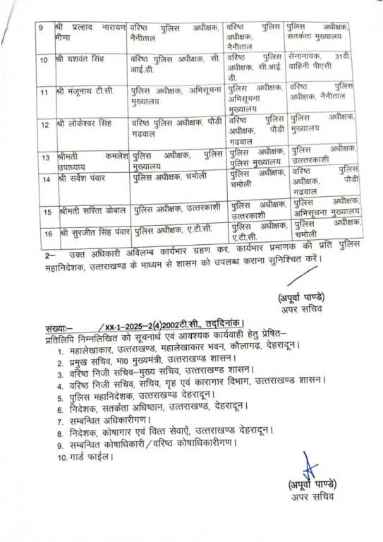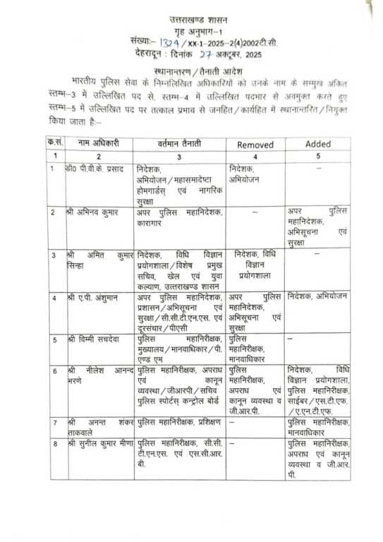 उत्तराखंड शासन में पुलिस विभाग में बड़ा प्रशासनिक फेरबदल , देखे सूची।