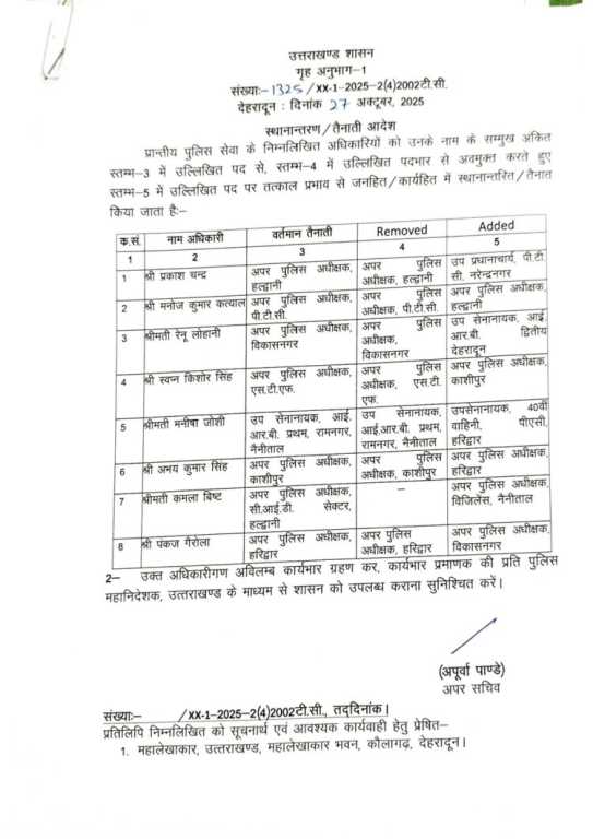 देहरादून। उत्तराखंड शासन ने सोमवार को पुलिस विभाग में बड़ा प्रशासनिक फेरबदल करते हुए कई भारतीय पुलिस सेवा (IPS) और प्रांतीय पुलिस सेवा (PPS) अधिकारियों के स्थानांतरण आदेश जारी किए। गृह विभाग की ओर से जारी आदेश के अनुसार, अधिकारियों को उनके वर्तमान पदभार से अवमुक्त कर जनहित एवं कार्यहित में नई तैनाती दी गई है।